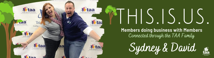 Sydney: David and I were on the Special Events Committee together and our relationship strengthened through volunteering with TAA at multiple events. At Maintenance Mania in 2017, I knew David and I were buddies forever. I was a new Supplier and moving into a sales role and David was able to give me some very helpful tips. In return, I helped him make some new connections. I knew I didn't want to be without David as a friend.